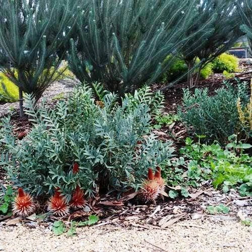 This groundcover banksia will be the star of your native border, spreading low and wide, luring in pollinators, attracting admiring looks from your friends and neighbours. We love the way the fat rust-red flowers nestle under the tall upright leaves, just as native mammals and birds will take shelter there too.