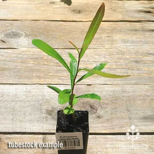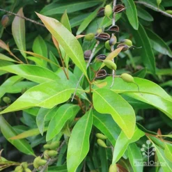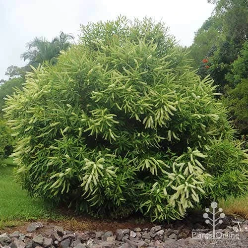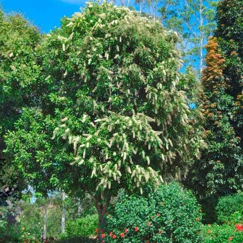 Ornamental native tree with dark glossy leaves and long white scented flower spikes which cascade downward. Very popular subtropical street tree, robust, shapely, eyecatching in full flowers; and enjoyed by birds and beneficial pollinators. You can make a bushtucker drink from the nectar-rich flowers, as Bridgette on our packing team did – see the photos!