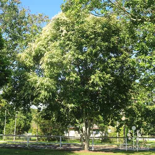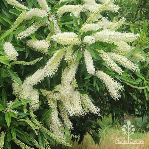 APPEARANCE : Ornamental native tree with dark glossy leaves and abundant long white grevillea-like scented flower spikes which cascade downward. Trees will sometimes flower on one side first.