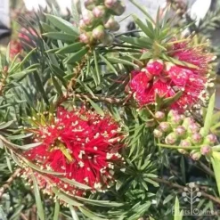 DESCRIPTION: A compact branching groundcover callistemon with neat form and fine stiff almost-spiny foliage which emerges in pale pink fluffy tufts. Large brilliant red brush flowers spangled with gold appear in spring. The parent form is indigenous to the Blackdown Tablelands of north Queensland