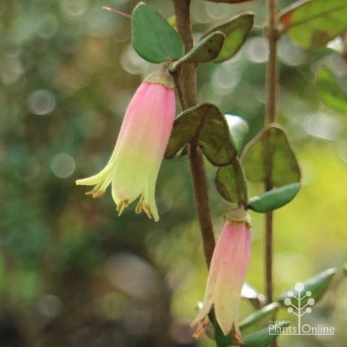 DESCRIPTION: Native flowering shrub with small oval dark green leaves; small bell-shaped flowers from spring to autumn, each peach-pink with a cream-yellow rim.