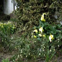 DESCRIPTION: Native flowering shrub from Tasmania and coastal Victoria. Lowgrowing, spreading, dense groundcover shrub with small rounded olive-grey leaves and pale lemon-yellow bell flowers most of the year. Occasional plants produce pink and lemon flowers but most plants are all-lemon